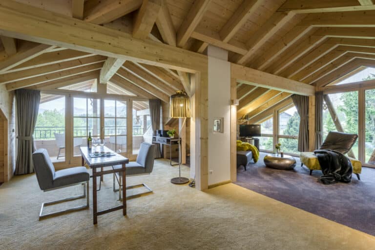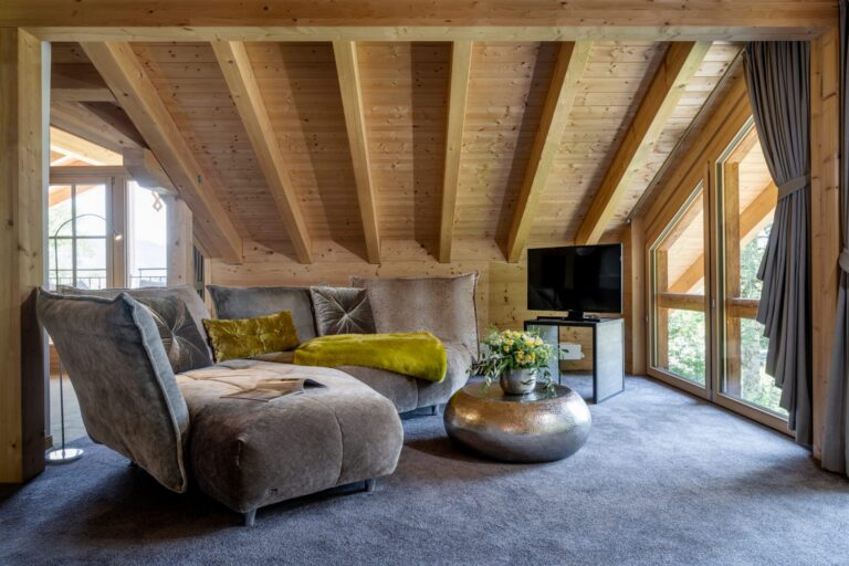Historische Materialien, modernes Design und eine warme Zirbenstube verbinden sich in dieser Obergeschoss-Lodge zu einem stilvollen Rückzugsort mit privater Sauna und weitem Panoramablick.