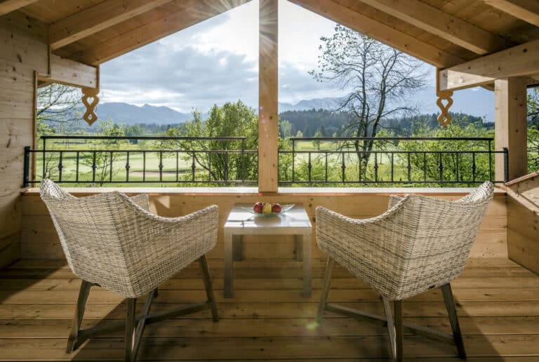 Eine exklusive Erdgeschoss-Lodge mit privatem Garten, eigener Sauna und offenem Kamin, die mit hochwertigem Design, lichtdurchfluteten Räumen und einem 180-Grad-Panoramablick auf die Allgäuer Bergwelt und den Golfplatz pure Entspannung verspricht.